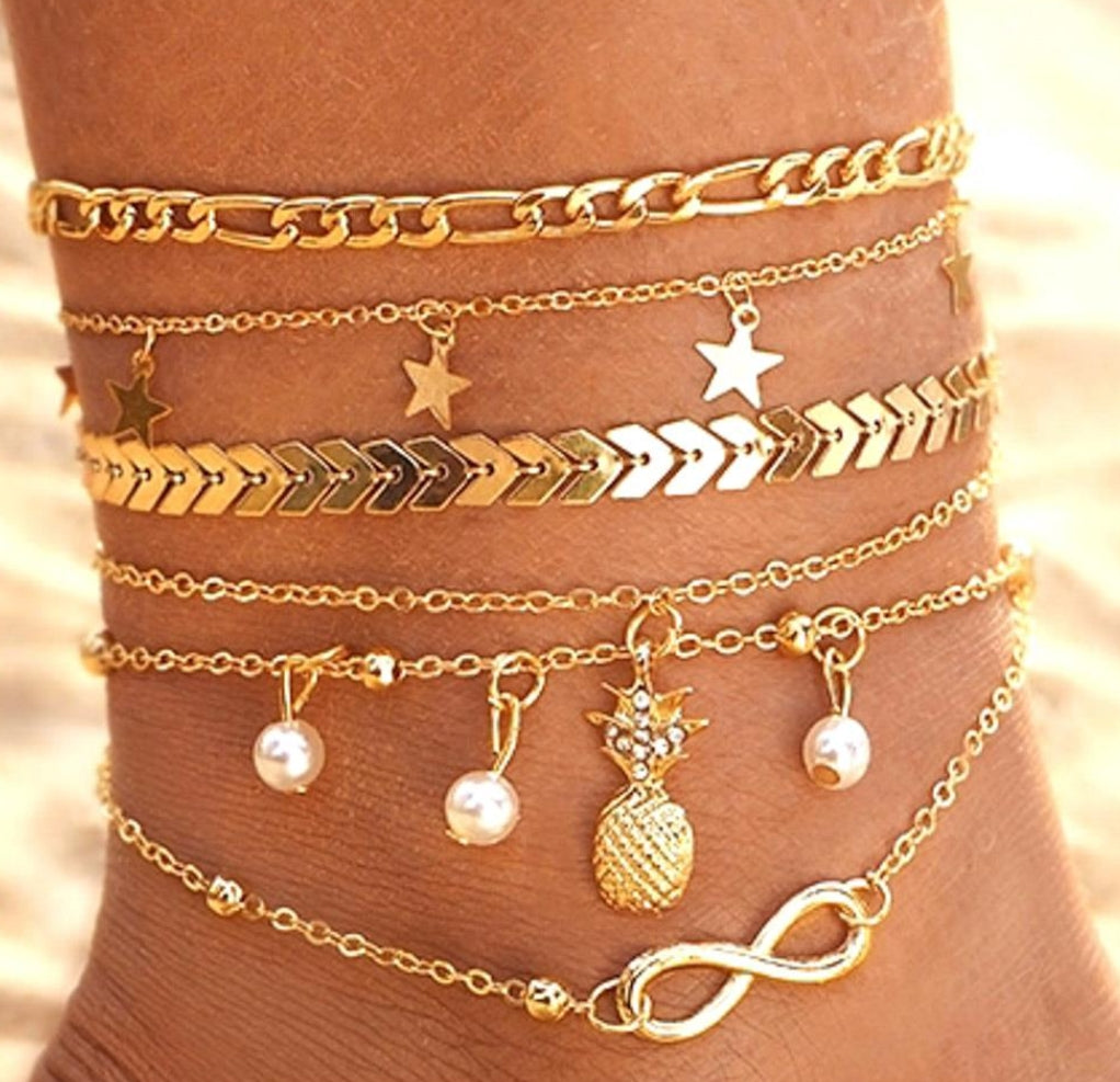 A Dipped Gold stylish set of six layered gold-tone anklets, adorned with charms including stars, pearls, a pineapple, and an infinity symbol, creating a trendy bohemian look.